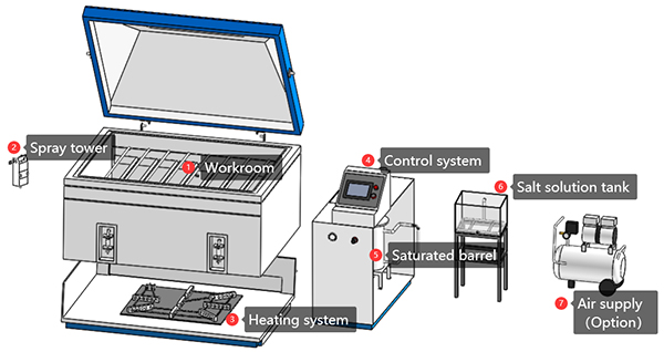 The saturated air barrel + atomizer tower architecture helps maintain a stable 35 °C fog environment with uniform spray density, which is critical for reproducible corrosion results.