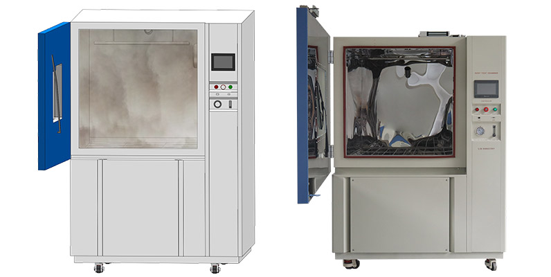 Available chamber volumes range from 800 L to 2000 L, suitable for different DUT sizes. A built-in dust-proof 16 A power outlet allows powered testing of samples during dust exposure.
