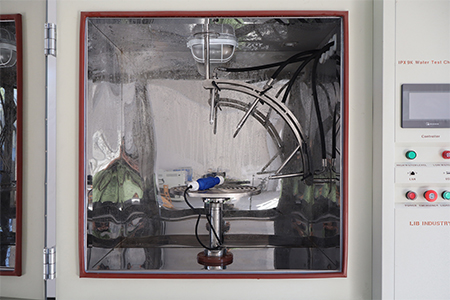 The water is sprayed from four angles of 0°, 30°, 60° and 90° respectively for 30 seconds in the Ipx9k test chamber. and water spray tests are performed at high pressure (8000-10000Kpa), high temperature (+88°C) and water flow rates of 14-16L/min, to test the water penetration resistance of products.
