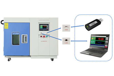 Intelligent Controller | Real-time temperature, humidity, and program status display. Supports 120 programmable segments with customizable ramp rates and cycles. Automatic regulation of heating, cooling, humidification, and dehumidification. LAN/USB enables remote monitoring, with built-in protections for safety.