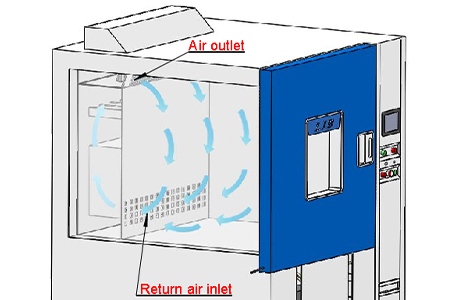 Air Circulation System High-efficiency centrifugal fan, the system provides top-to-bottom air circulation for uniform temperature and humidity distribution. This ensures consistent test conditions across all sample locations. | Control System A 7-inch PID programmable touchscreen allows full control of temperature, humidity, and gas concentrations. The system supports fixed and programmable operation modes, data logging via USB or Ethernet, and multilingual interface options, enabling precise, repeatable, and user-friendly testing.