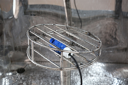 IPX3 Test: Oscillating tube sprays water from multiple angles to simulate rainfall